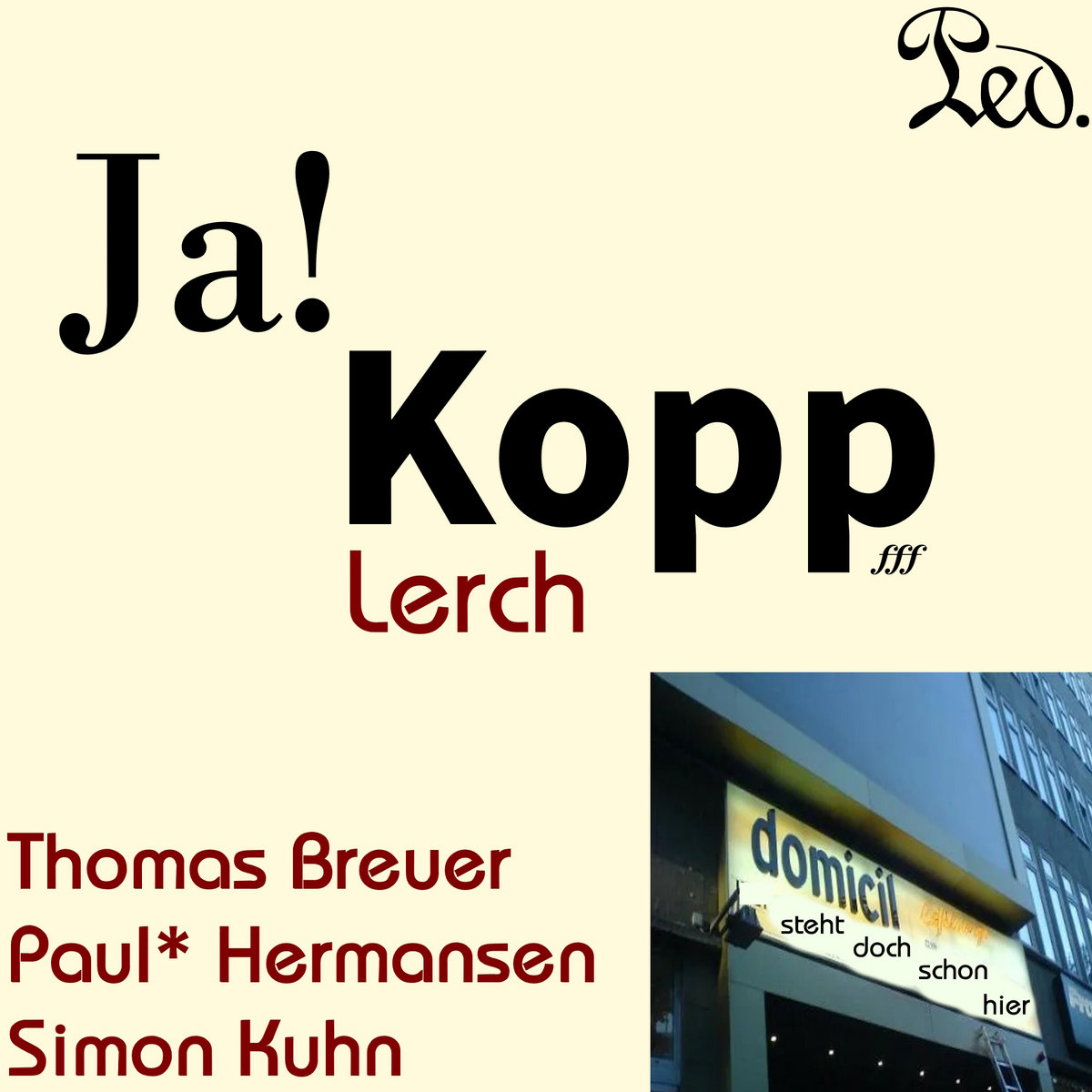 Ja! Kopp Jakob Lerch - saxophone, flutes, percussion, objects Paul* Hermansen - melodica, flutes, voice, piano, percussion, obejcts Thomas Breuer - guitar, objects, voice Simon Kuhn - drums, percussion recording & mastering - Paul* Hermansen cover art - Paul* Hermansen recorded March 18, 2024 live @domicil Dortmund bandcamp |